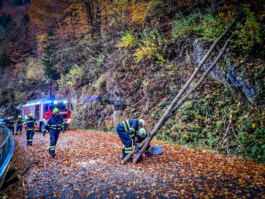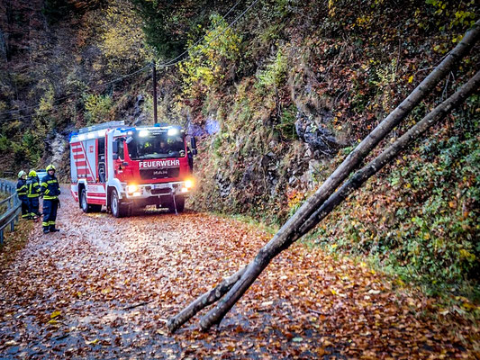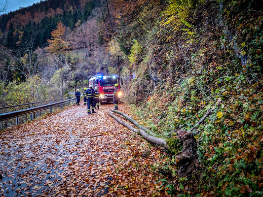 Durch Wind & Regen wurde ein Baum entwurzelt und kam auf der Fahrbahn zum liegen.