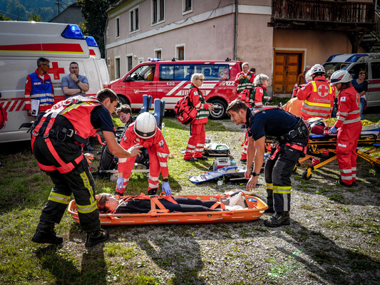 Danke an die vielen Reichraminger Statisten (20 Personen), die realitätsnah mit typischen Verletzungsmuster geschminkt worden sind, um das Szenario möglichst authentisch zu gestalten. Dadurch konnten nicht nur die Feuerwehren die Rettung der Personen aus dem Gebäude üben, sondern auch die 17 Rettungskräfte des Roten Kreuzes die medizinische Erstversorgung und Betreuung intensiv trainieren. Davon war ein Team welches für die Krisenintervention zuständig war mit dabei.