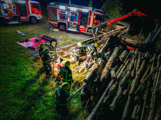Bei unserer Gruppenübung am 16. Oktober 2025 haben wir ein Szenario simuliert, bei dem ein Unfall beim Beladen von Holzstämmen auf einen Holzanhänger aufgrund eines Hydraulikproblems auftrat.