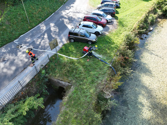 Am Donnerstag, den 18. September 2025, stand am Übungsplan der Gruppe 2 & 3 das Einrichten einer Wasserentnahmestelle mit unserer Tragkraftspritze FOX 4 an der Ennsbrücke Rohrbachgraben.