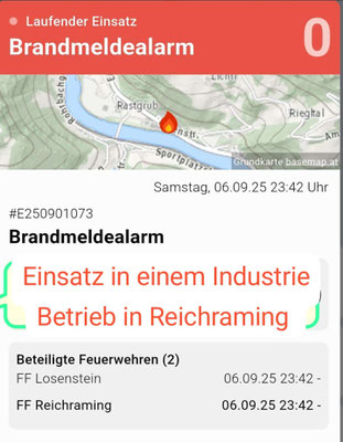 Am Samstag, den 6. September 2025, wurden wir kurz vor Mitternacht zu einem Brandmeldealarm gemeinsam mit der Feuerwehr Losenstein alarmiert.