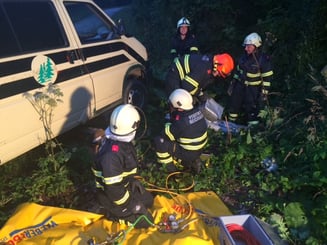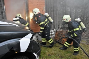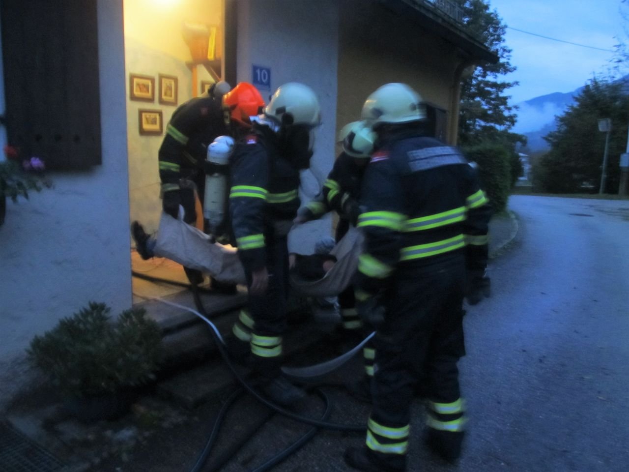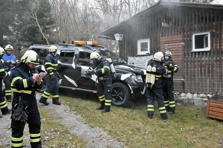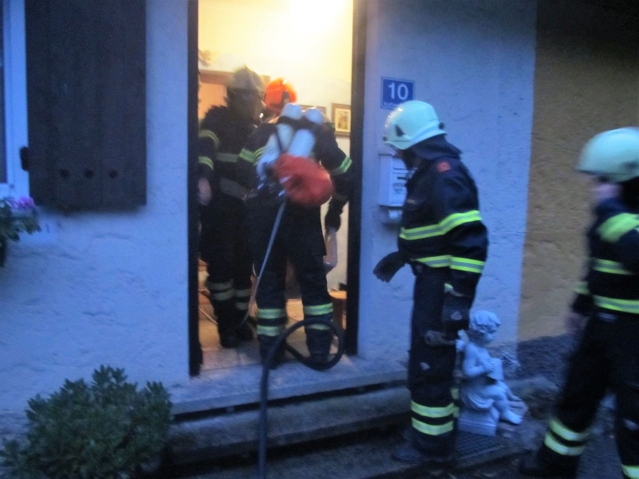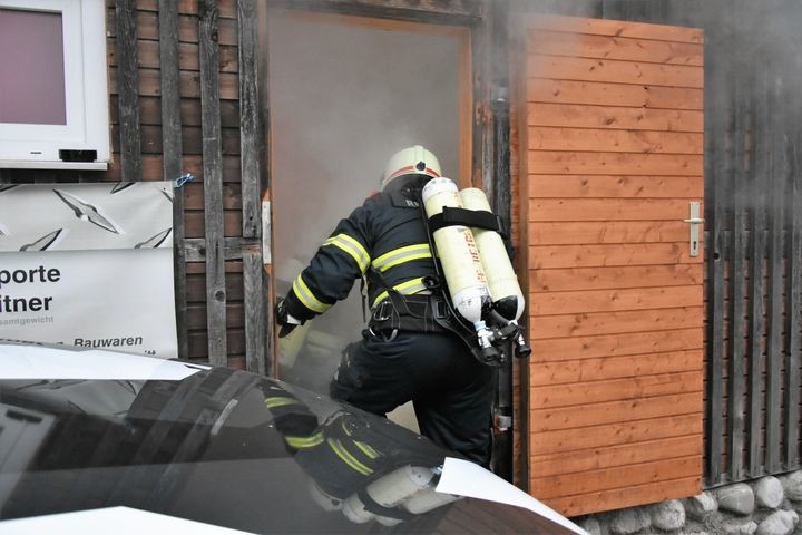 Auf Grund der Übungsannahme wurde sofort nach Eintreffen des Vorausfahrzeuges und des TLF mit der Absicherung der Gefahrenstelle sowie der Rettung der eingeschlossenen Person mit schwerem Atemschutz begonnen. Zuerst musste allerdings ein Fahrzeug entfernt werden, das den Zugang zum Schuppen blockierte. Dies wurde mit Manneskraft umgesetzt. Die Rettung der eingeschlossenen Person sowie die Erstversorgung erfolgte dann rasch durch den Atemschutztrupp.