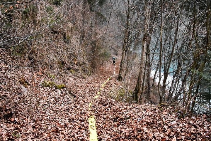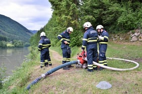 Zwischenzeitlich wurde durch die Mannschaft des LFB eine Wasserentnahmestelle an der Enns aufgebaut und die Löschwasserförderung zum TLF in sehr kurzer Zeit aufgenommen. Das Problem war hier sicherlich der Zugang zur Wasserentnahmestelle - über die eigentlich die ganze oberhalb liegende Siedlung mit mehr als 30 Häusern versorgt werden muss - weil hier der Steig durch die Witterungseinflüsse stark in Mitleidenschaft gezogen wurde. Nach Kontrolle der maximalen möglichen Literleistung der sich im Einsatz befindlichen Pumpe konnte die Übung positiv beendet werden.