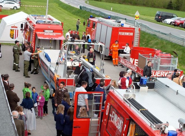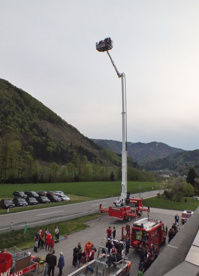 Am Samstag den 25.April Vormittags bestand wieder die Möglichkeit zur Feuerlöscher Überprüfung. Um 18:00 Uhr begann dann die offizielle Festeröffnung mit der Begrüßung der Ehrengäste durch unseren Kommandanten HBI Thomas Schwingshackl. Begrüßen konnte er unter anderem unseren Landesbranddirektor Dr. Wolfgang Kronsteiner, Bgm. Reinhold Haslinger, einige Gemeinderäte, Bezirksfeuerwehrkommandant OBR Wolfgang Mayr sowie Abordnungen von etlichen Feuerwehren des Bezirks Steyr-Land. Mit der Präsentation des Feuerwehrstützpunktwesens in OÖ wurde die Festveranstaltung fortgesetzt. Dazu hatten wir Spezialisten und Gerätschaften der Einsatzbereiche Wasserwehr/Tauchen, Höhenrettung/Hebebühne, Waldbrandbekämpfung, Flughelfer/Hubschrauberunterstützung und Ölwehr eingeladen. Diese Gelegenheit, sich über die Kompetenz dieser speziell geschulten und im Einsatz erprobten Kameraden sich selbst ein Bild zu machen, haben doch einige Reichramingerinnen und Reichraminger genützt. Ebenso haben sich sehr viele Gäste auch einen Überblick aus 32 m Höhe bei einer Fahrt mit der Feuerwehr-Hebebühne verschafft.